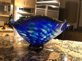 The temperature of the glass when I pulled it out of the ovens each time was about 2000degrees. That blue bowl was still about 1100-1200 degrees. We had to be very careful as even if a a piece of glass looked cooled we were warned not to touch it. We also had to make sure we held the pipes at less half way back from the heated end with glass and once we were done with the pipe we set them down and did not touch that one again. We had a clean pipe for every project. Then four of us had been slipt into two team with an instructor per team of two. Even though it was snowing outside they had the back door open and we were all nice and warm.